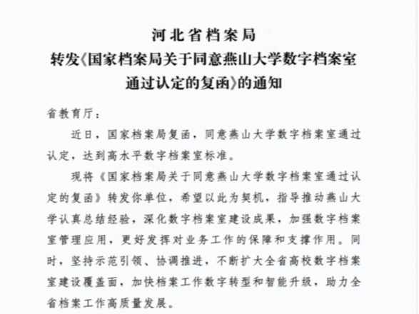 【新闻中心讯】近日,从河北省档案局传来喜讯,国家档案局正式复函同意燕山大学数字档案室通过认定,达到“高水平数字档案室”标准。这一认定标志着燕山大学档案馆在档案数字化建设领域迈入全国先进行列,成为全国首批按新指标通过验收的高校之一,也是学校档案工作高质量发展的重要里程碑。国家档案局正式复函(以上图片由档案馆提供)自启动全国数字档案室试点建设以来,燕山大学以“标准化、规范化、数字化”为目标,全力推...