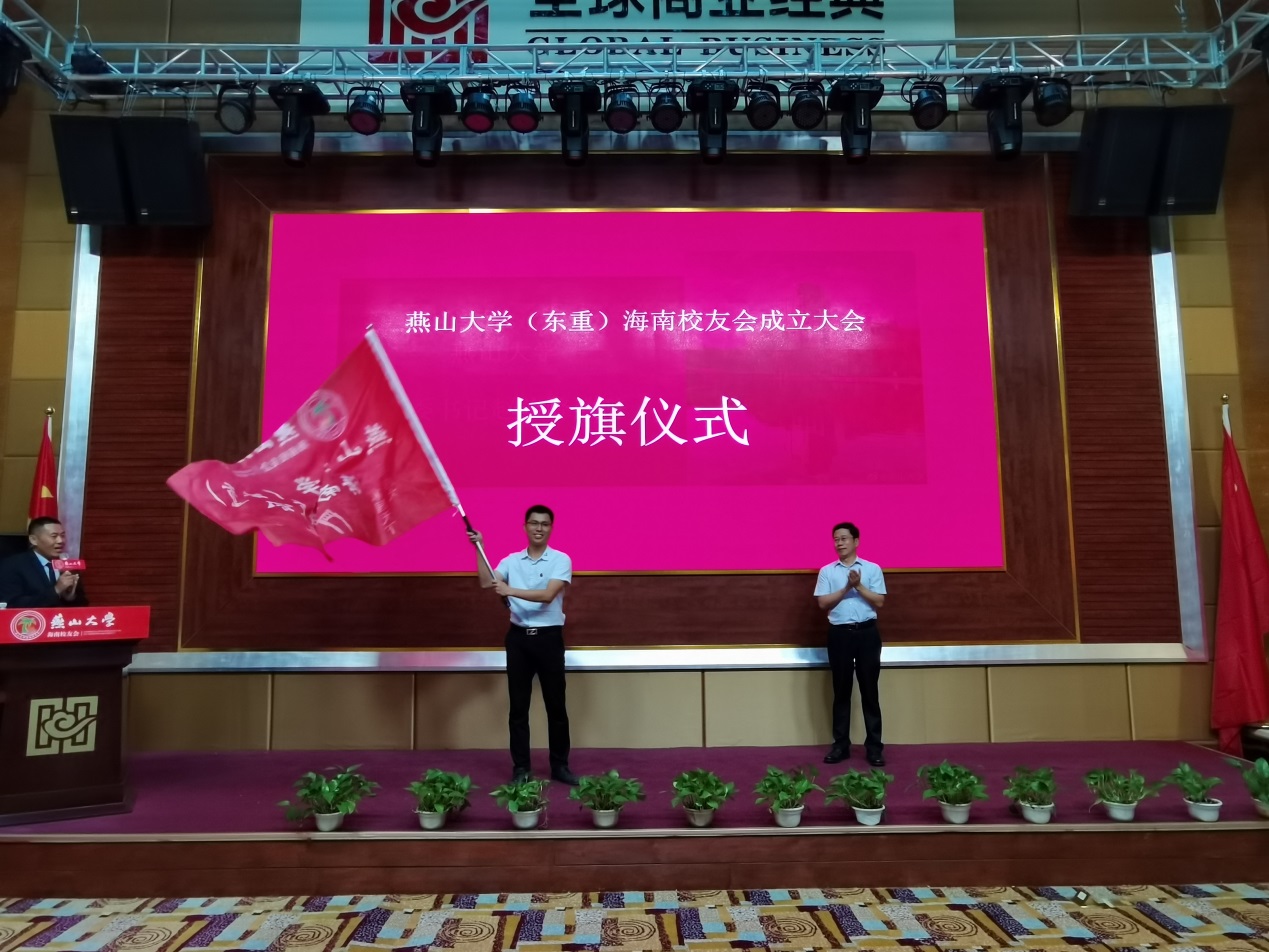 赵险峰向海南校友会代表授旗,王跃华为成人论坛(东重)海南校友会主席、理事颁发聘书。