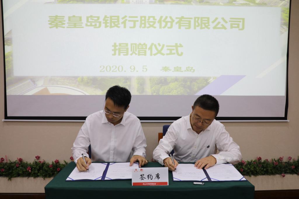 【新闻中心讯】9月5日上午,在世纪楼2101会议室举行秦皇岛银行股份有限公司捐赠仪式。秦皇岛银行股份有限公司董事长张文权、行长李国强,校党委书记赵险峰,党委常委、副校长任家东,以及秦皇岛银行和学校相关部门参加捐赠仪式。仪式由团委副书记、校庆办副主任、校友办副主任张杨主持。