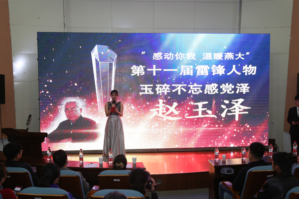 典礼在校团委副书记张杨的致辞中拉开序幕。他代表校团委向为燕大工作奉献的教职工表示感谢,对有着感人事迹的雷锋人物表示敬意,并表示燕大有爱,每时每刻都有感动存在。大屏幕上依次以视频形式展示燕园雷锋人物的先进事迹。原校工会主席赵玉泽,为党的征程奋斗60年贯穿了他的大半生,为学校建设发展奉献了所有热忱,临终前交纳的“特殊党费”更是让人为之潸然泪下;荣誉等身的黄真教授一片赤心、爱国如家,他既是甘愿为国奉献所有知识与力量的赤子,又是一位积极鼓励、帮助学生发展的良师;在燕大后勤兢兢业业工作12载的维修工人高军用风雨无阻诠释了“尽职尽责”,用任劳任怨书写了“坚守”;高峰,身为辅导员,既是学生的良师,更是他们的益友,他用文字间的轻松开导学生,用话语间的温暖传递祝福,用眼神里的支持表达鼓励;陈天麟,在天津塘沽大爆炸弥漫的灰尘里有他坚毅的身影,在大大小小的公益活动里有他的点滴付出,小爱汇聚成大爱,不忘初心,一往无前;燕大“知了”,每一位失主对物品失而复得的笑容,便是他们最珍贵的守候。一幅幅画面,一位位人物,无一不以其独特的雷锋精神感动着在场的每一个人。