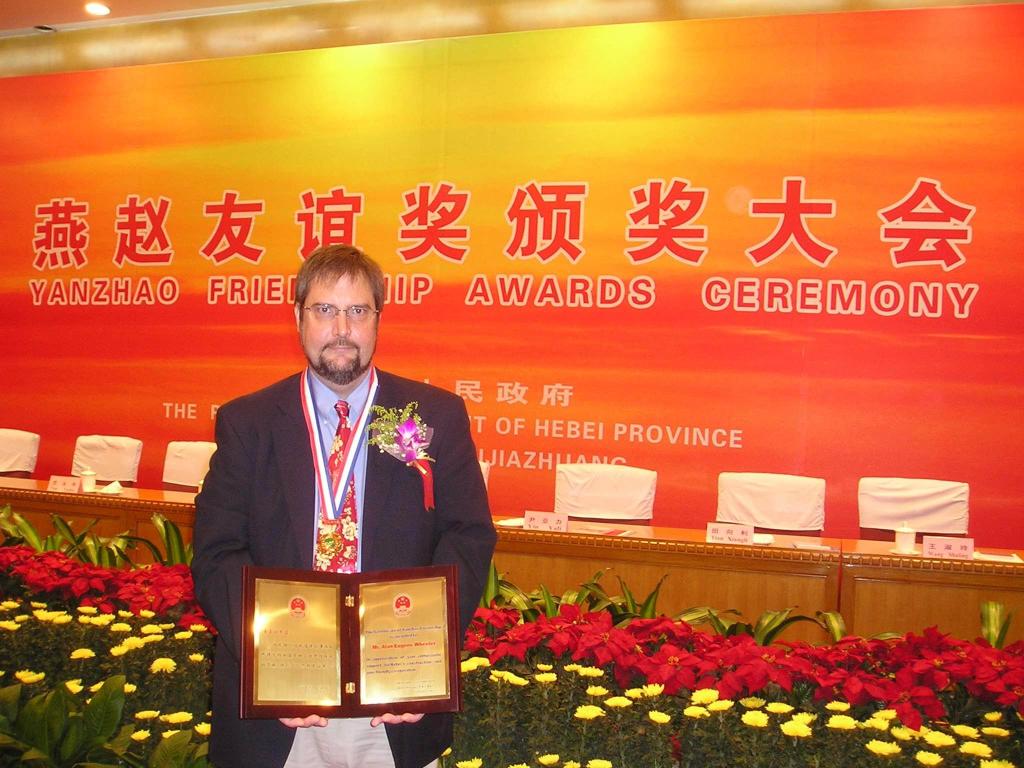 【新闻中心讯】我校外籍教师韦书伦(Alan Wheeler)于近日获得2007年“燕赵友谊奖”。国庆前,他在国际合作处副处长陆军的陪同下赴石家庄参加了颁奖典礼和省政府组织的国庆招待会。