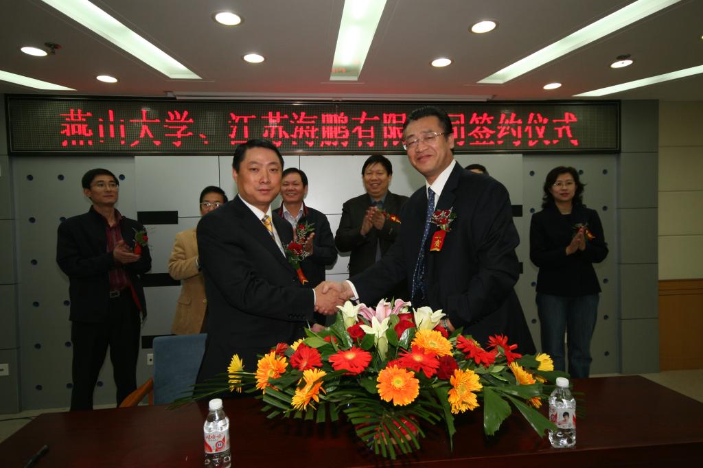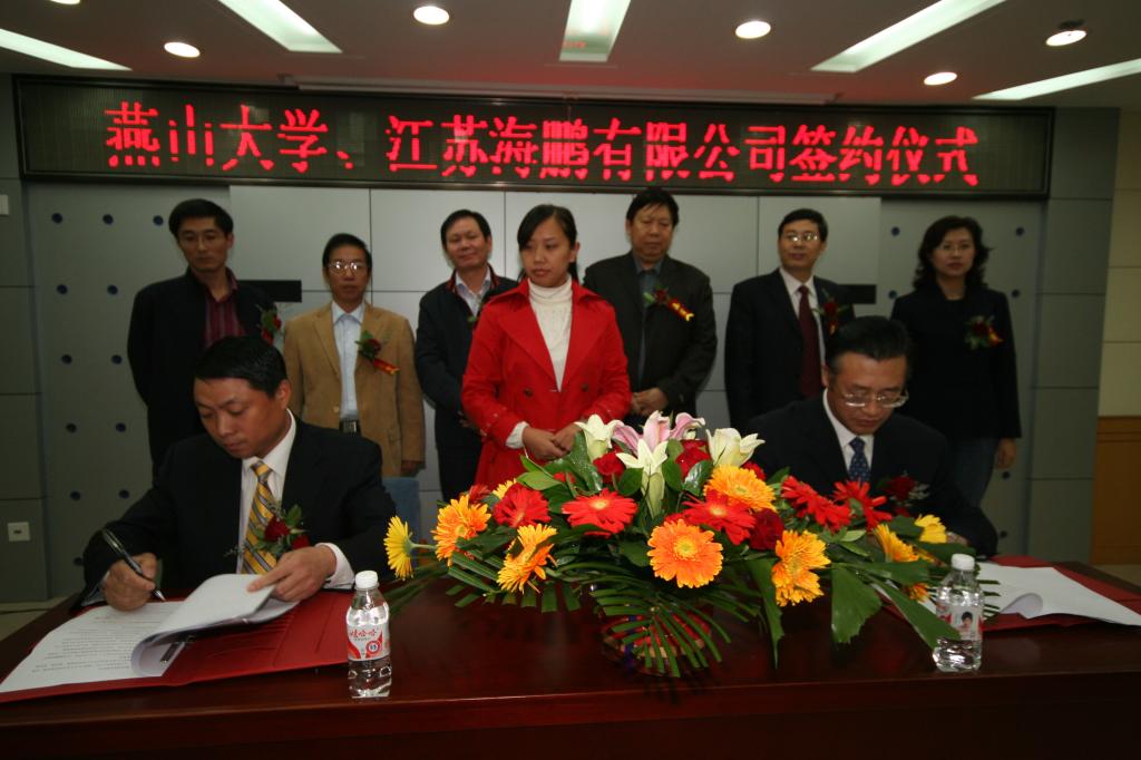 【新闻中心讯】2007年10月19日上午9:00在世纪楼会议厅,燕山大学副校长、产业集团董事长邢广忠与江苏省海鹏特种车辆有限公司董事长胡鹏飞作为代表签署了《燕山大学与江苏海鹏特种车辆有限公司产学研合作协议》。燕山大学校办副主任丁华、机械工程学院院长赵永生、江苏省江阴经济开发区靖江园区主任高林嵩、江阴市科技局副局长胡宪、江阴经济开发区靖江园区经济发展局局长钱小飞、江苏省海鹏特种车辆有限公司副总经理董毓祥等出席了签约仪式。燕山大学国家大学科技园、产业集团党委书记赵静一主持了签约仪式。