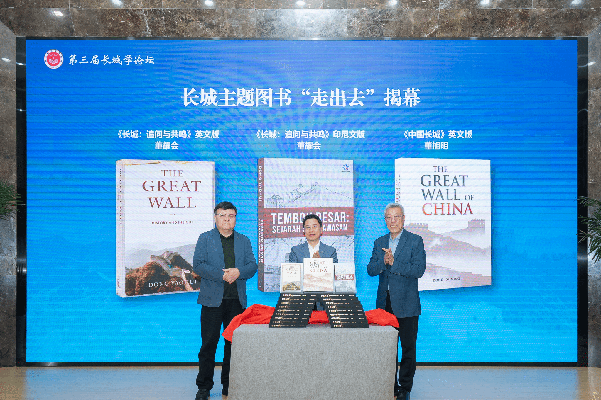 论坛开幕式上举行了长城主题图书“走出去”揭幕仪式,赵险峰与作者董耀会、董旭明为《长城:追问与共鸣》英文版、印尼语版,《中国长城》英文版3种精品图书揭幕。