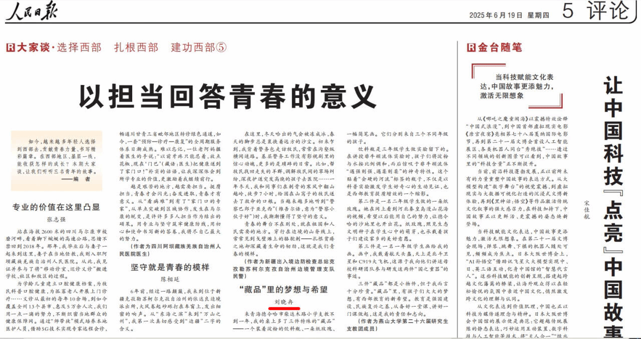 【新闻中心讯】6月19日,一篇题为《“藏品”里的梦想与希望》的文章在《人民日报》上刊发。文章聚焦成人论坛第26届研究生支教团成员刘晓冉的支教故事,通过讲述其在支教服务期间的真实经历与深刻感悟,生动诠释了新时代燕大青年主动投身西部建设、贡献青春力量的使命担当与赤诚情怀,为高校开展青年实践育人工作树立了典范、提供了鲜活范例。