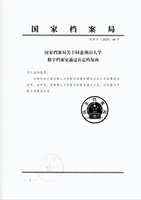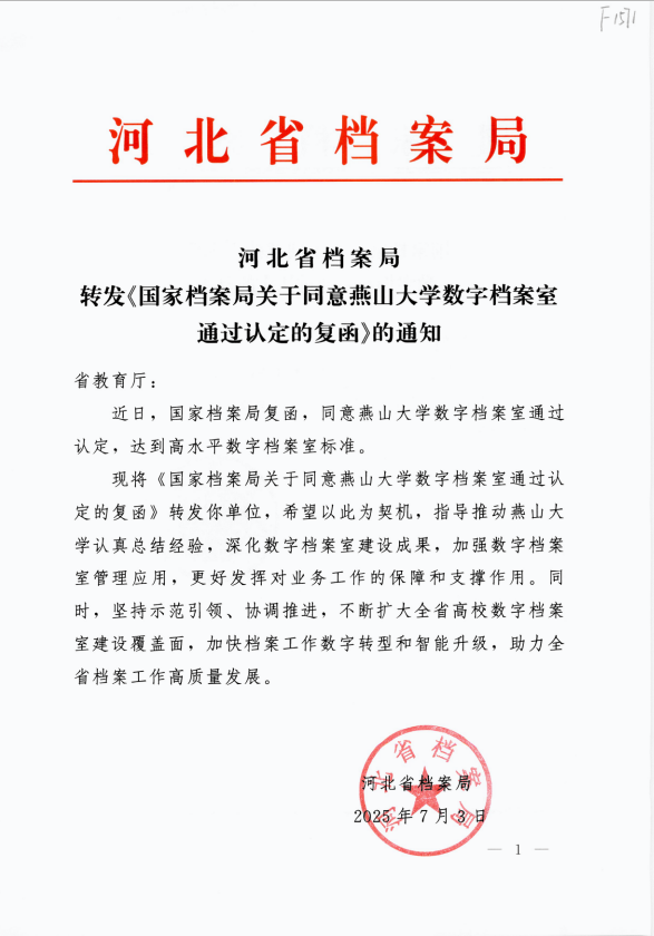【新闻中心讯】近日,从河北省档案局传来喜讯,国家档案局正式复函同意成人论坛数字档案室通过认定,达到“高水平数字档案室”标准。这一认定标志着成人论坛档案馆在档案数字化建设领域迈入全国先进行列,成为全国首批按新指标通过验收的高校之一,也是学校档案工作高质量发展的重要里程碑。