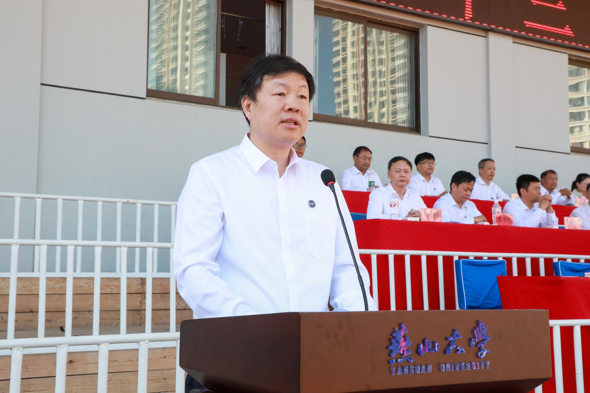 副校长李春玲致开幕词,她表示,从国家体育发展的宏大蓝图,到校园的体育实践,我们始终紧跟步伐、笃行实干。过去一年,学校以《燕山大学新时代体育工作方案》为纲领,绘就了体育育人的新图景:“课内外一体化”打破课堂边界,“一院一品”打造专属体育品牌,“早训晚练”让健康理念深入人心;研究生公共体育课程从无到有、从有到优,500余人次选课热潮,坚定了我们研究生体育课全覆盖的育人承诺。体育的魅力,在于超越自我,也在于汗水浇灌出的荣光。在过去的一年,燕大学子在健美操、花样跳绳、射箭、散打等各类大学生竞赛项目中,斩获国家级竞赛奖项25项,其中冠军奖项9项,亚军奖项8项,季军奖项8项;在河北省大运会摘得男子丙组铁饼冠军、5个项目挺进前八,以上成绩充分展现了学校体育育人的丰硕成果。她表示,本届运动会,既是对我校体育工作的全面检阅,更是激励全体师生以运动之名,铸奋斗之魂的动员令。希望运动员们以拼搏诠释燕大精神,赛出风采与实力;裁判员们以公正守护赛场尊严,执裁严谨高效;师生们以热情传递运动力量,共享竞技乐趣。