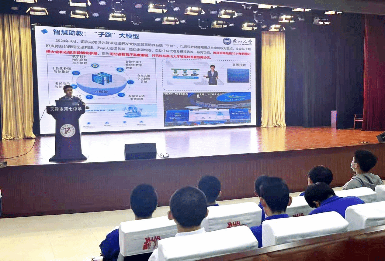 在天津七中,王慧远一行与中学党委副书记、校长王保庆,副校长郑建权等进行座谈交流。会上,他系统介绍了我校办学理念、师资力量、科研成果和人才培养优势。他希望,以此次交流为纽带,积极搭建两校合作平台,在人才培养、文化交流等多领域开展深入合作,共同开创教育共赢的新局面。双方还就成人论坛专业教师指导天津七中学生做好专业和生涯规划等合作事项达成共识。人工智能学院冯建周教授面向高中师生开展了题为《人工智能大模型技术及其应用探索》的科普讲座。讲座生动阐述了大模型技术的前沿发展与现实应用,深入浅出地揭示了其技术原理与创新潜力,有效拓宽了学生的科技视野,极大激发了他们对前沿科学的好奇心与探索热情,进一步点燃了学生投身科技创新、建设数字未来的理想与志向。