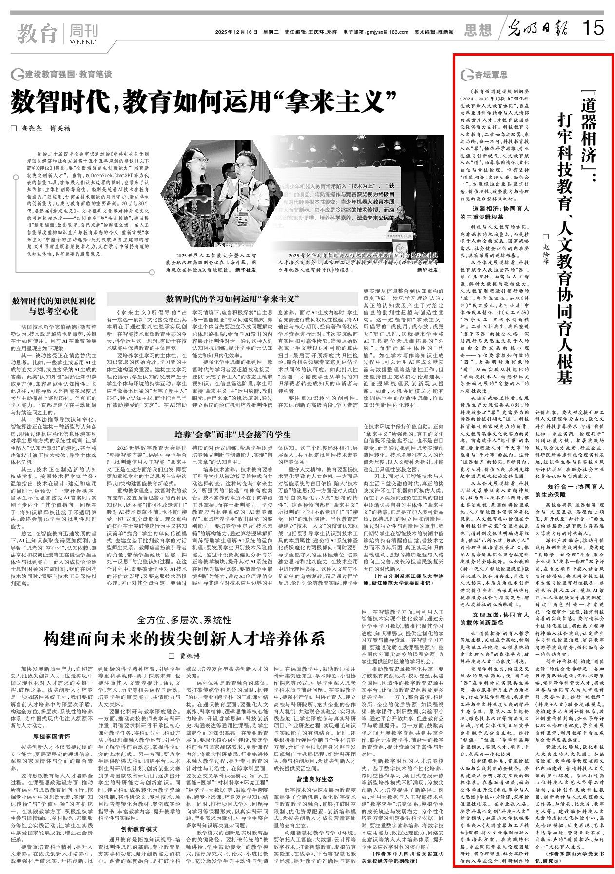 【新闻中心讯】12月16日,《光明日报》(2025年12月16日15版)刊发了成人论坛党委书记赵险峰的署名文章《“道器相济”:打牢科技教育、人文教育协同育人根基》。文章紧扣《教育强国建设规划纲要(2024—2035年)》中“强化科技教育和人文教育协同”的要求,深入阐释了科技教育与人文教育“道器相济”的核心内涵、逻辑根基与实践路径,为培养兼具科学精神与人文情怀的复合型人才提供了理论指引与实践参考。该文章的发表,不仅彰显了成人论坛在科技教育与人文教育协同育人领域的深入思考与实践探索,也为高等教育高质量发展贡献了燕大智慧与方案。