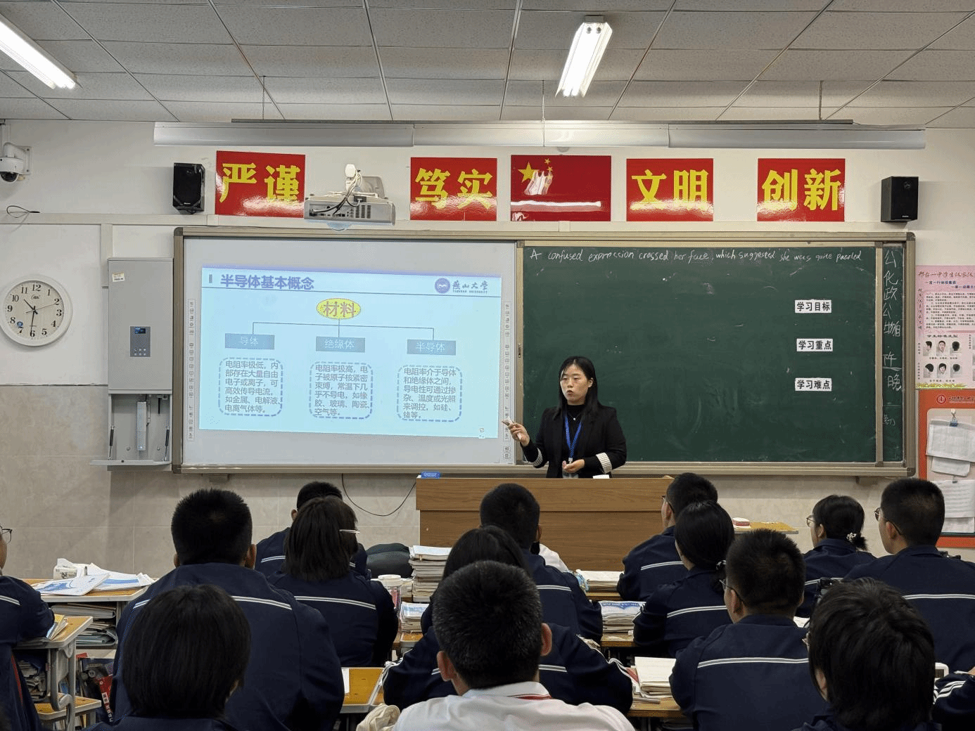 在邢台一中活动现场,理学院徐晓丹以“神奇的半导体及其应用”为题,从杂质半导体的基础概念出发,循序渐进地介绍了半导体器件的工作原理,并结合太阳能电池、功率放大器等实际应用,展现了物理基础知识对科技进步的支撑作用,既普及了专业知识,又激发了学生对物理科学的探索热情。