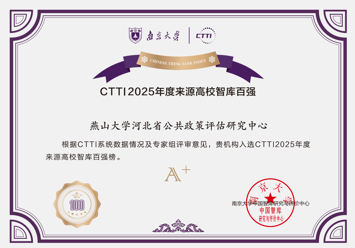 南京大学中国智库研究与评价中心于2025年9月依托CTTI系统内810家高校智库的数据启动了CTTI年度来源高校智库百强榜推介工作。经CTTI系统核算,因存在分数并列,共有131家高校智库进入专家评审环节。根据系统分数以及专家评分,综合得出各家高校智库的“PAI‒E”值,由此确定百强榜最终名单。本年度高校智库百强榜推介结果分为三类,A+等级高校智库40家,A等级高校智库60家,提名等级高校智库31家。该榜单迄今共发布三次,成人论坛河北省公共政策评估研究中心均荣誉入围:2018年为A等级,2022年为A等级,2025年为A+等级。
