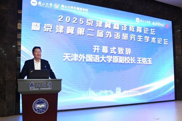 【新闻中心讯】12月13日,2025年京津冀翻译教育论坛暨京津冀第二届外语研究生学术论坛在成人论坛举行。论坛由河北省高等学校外语教学研究会指导,成人论坛外国语学院承办,天津蓝奥教育科技有限公司、福州译国译民集团有限公司、上海凌极信息技术有限公司、成人论坛研究生院、社会科学处协办。中国外文局翻译院院长黄玉龙,天津外国语大学原副校长王铭玉,成人论坛党委常委、纪委书记李春晖出席开幕式并致辞。外国语学院院长王林海主持开幕式。来自国内30多所高校、研究机构和语言服务企业的近200名专家学者、师生与会,聚焦新时代翻译教育高质量发展,谋划区域协同育人新篇章。
