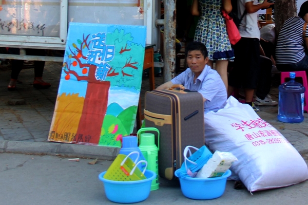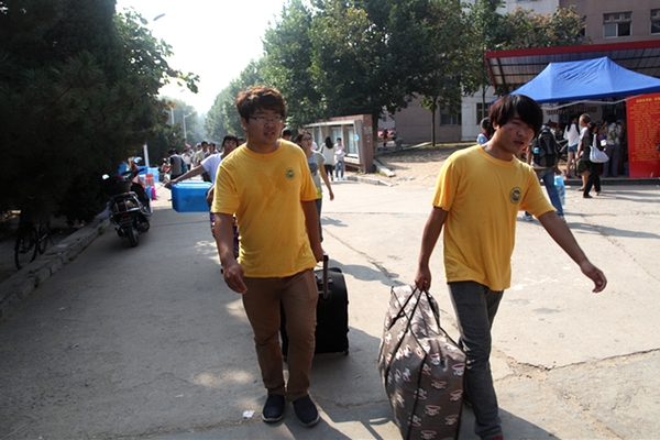 汗流浃背的志愿者同学帮助新生搬运行李