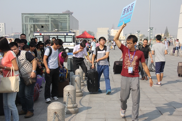 火车站迎新工作人员正在引导新生和家长走向大巴前往成人论坛