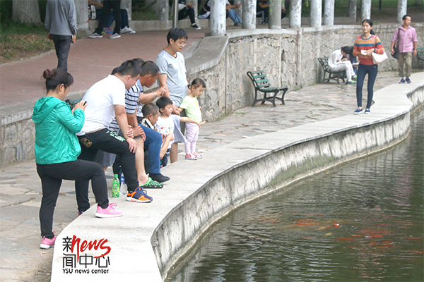 送我来大学的妹妹很喜欢燕鸣湖里的鱼,湖里的鱼真的好大啊。(张怡然 摄)