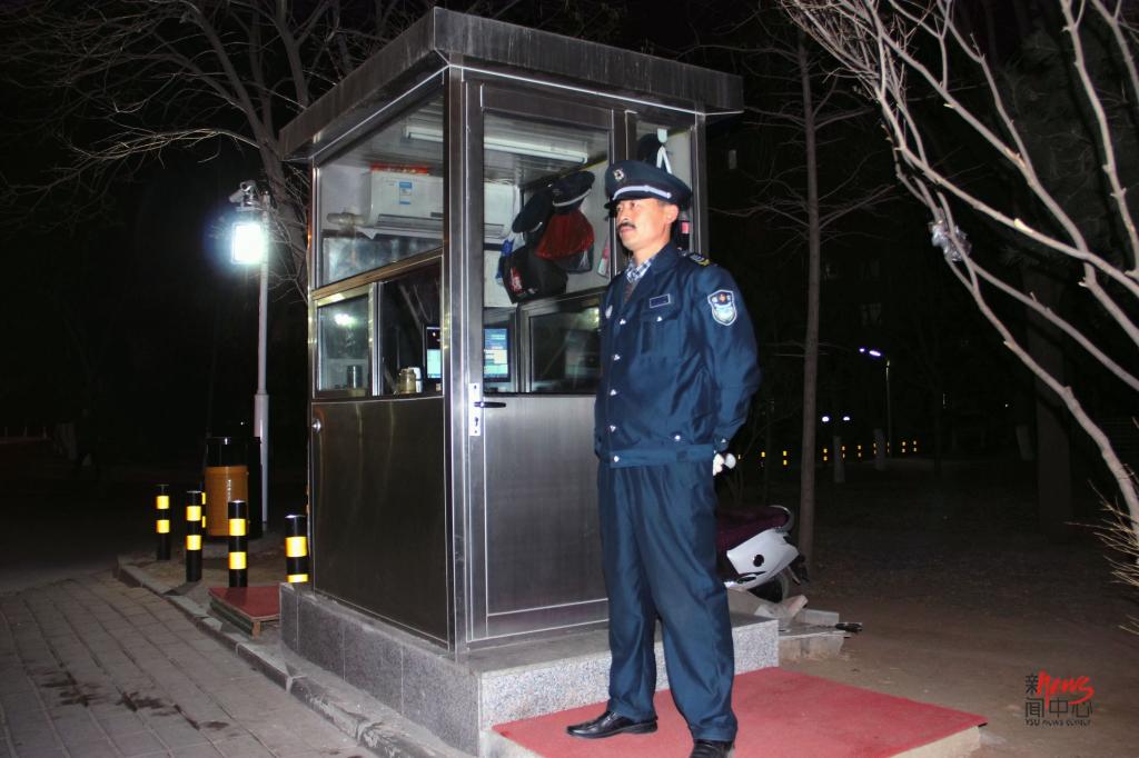 夜已深,门卫师傅依然为了校园安全坚守着岗位 (李晖 摄)