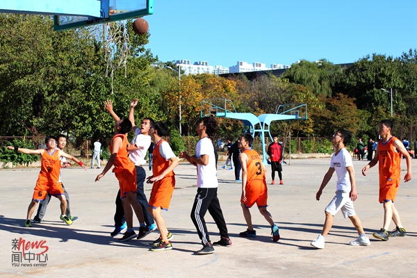 11:00 体育场上跳跃着打篮球的身影(高茜/摄)