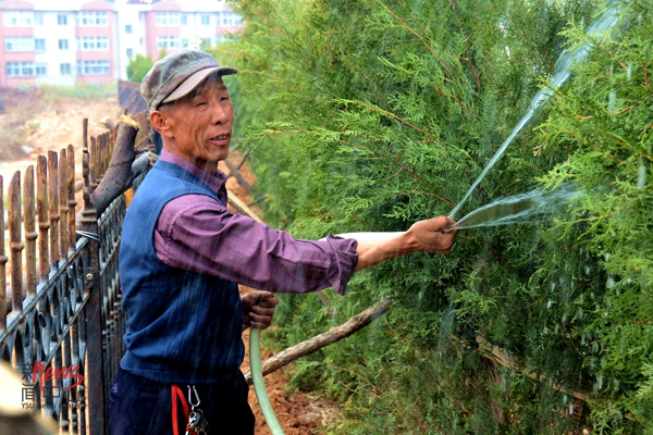 10:00 绿化管理工人浇灌校园中的草木(何景泉/摄)
