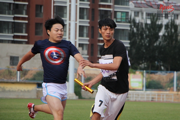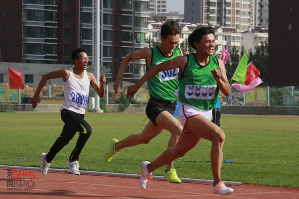文法学院魏爽在4乘100米比赛中跑第一棒(蔡巧怡/摄)