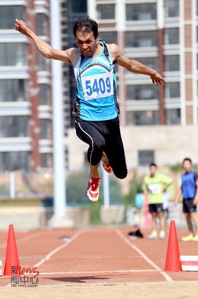 机关职工王鑫参加教工男子甲组跳远决赛(蔡巧怡/摄)