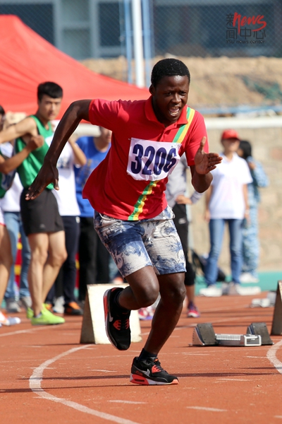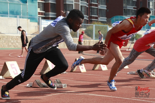国际教育学院马格参加学生男子组100米比赛(蔡巧怡/摄)