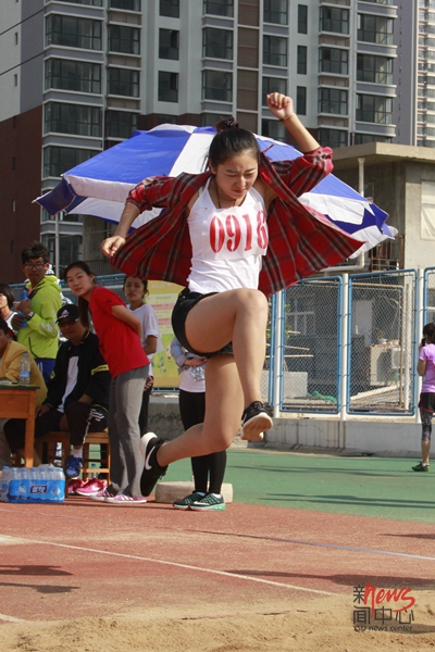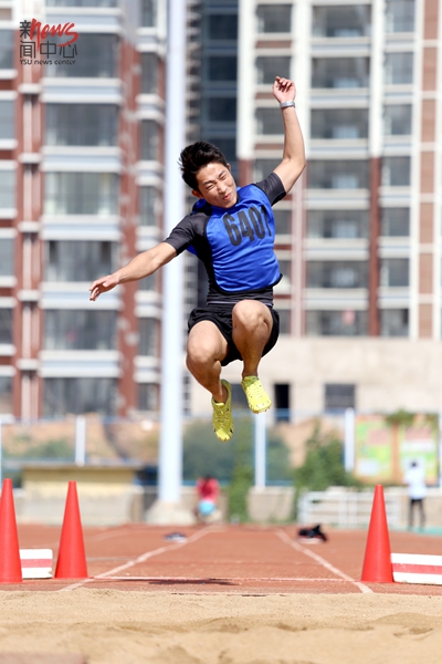 里仁学院姜凡在三级跳决赛中精彩一跃(毕佳畅/摄)