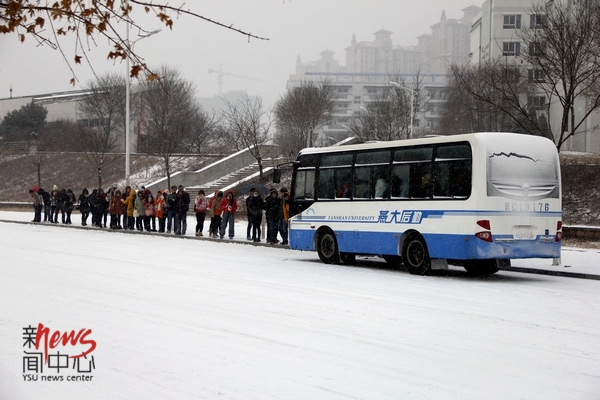 校车前的队伍在雪景中不失文明色彩(许泽宽/摄)