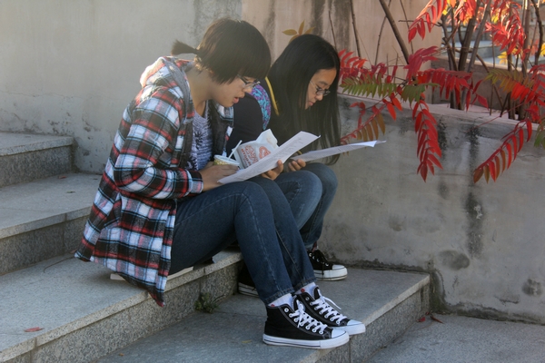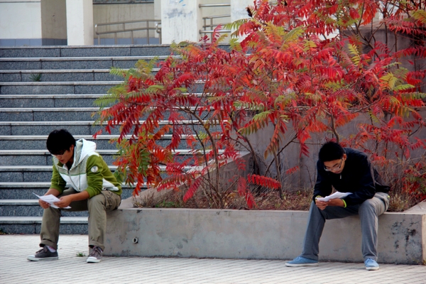 “晨时书香别映红”·10月16日早7:00·西区一教旁台阶上(齐智颖/摄)