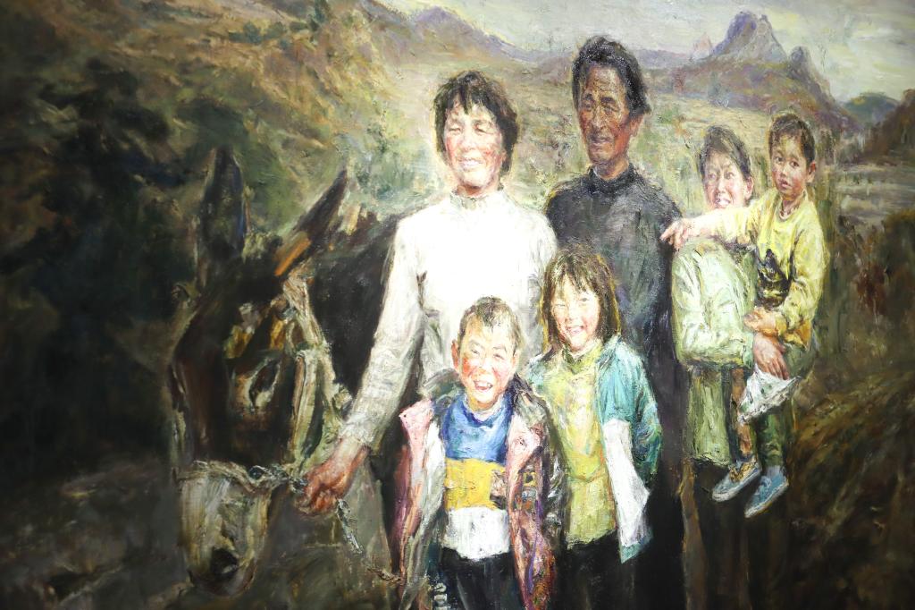 为时代作画,予后人讲解。画中人形态神情各异,有衣着简陋,但面上含笑,像是在向后人讲述,独属于他们那个时代的快乐;亦有神情坚定,严肃对“镜头”,肩扛麻绳,手托长棍,述说他保家护国的决心;或执笔画梅,绘竹,颂坚毅顽强,喻时代铿锵。