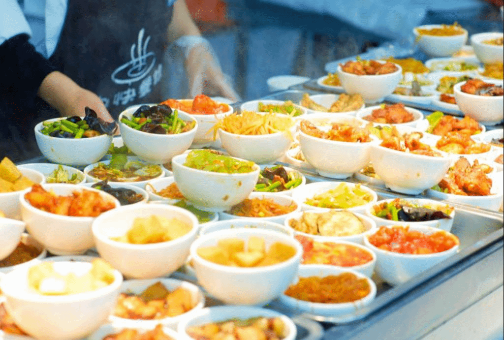 东北小碗菜琳琅满目,荤素搭配,应有尽有