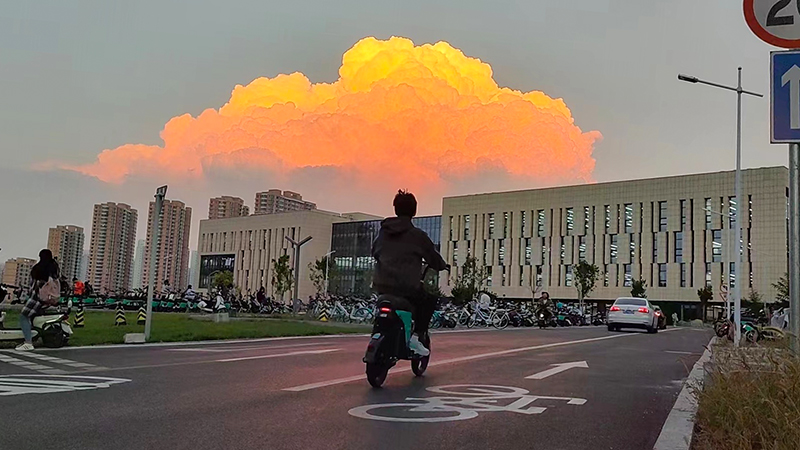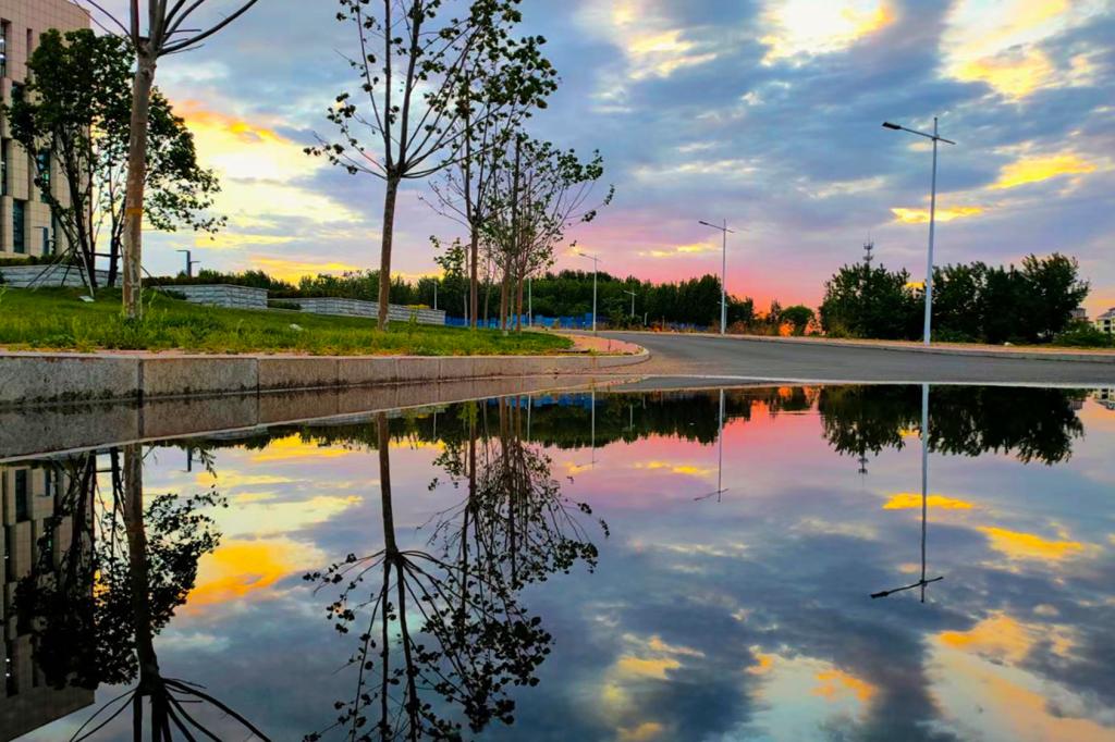 当落日的余晖遇到漫画云,霞的色彩染红了燕园外那片宁静的海