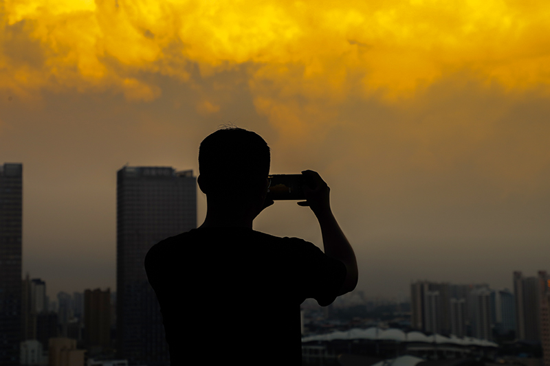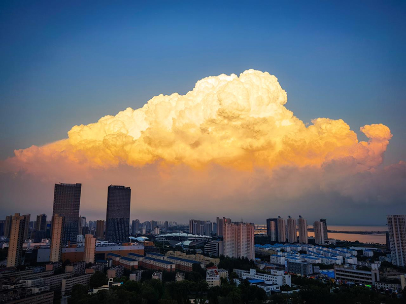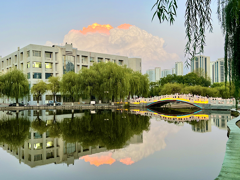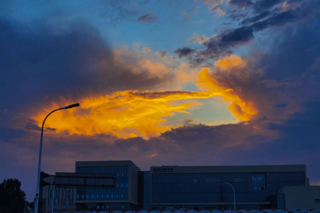 夕阳渐下,天云融为画。带着迟暮的霞光,缱绻的云似浪漫的篝火,炽烈地点燃了远处的天空。从浅金到酡红,不断萦绕翻涌,随天色渐暗。落日弥漫的天边,橘光闪烁,云朵温柔。你我一同沉醉在这绚丽的云海,诉说着对燕大赤诚的爱。