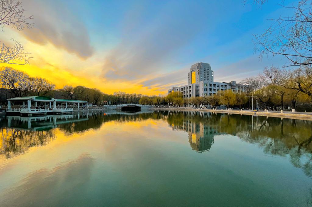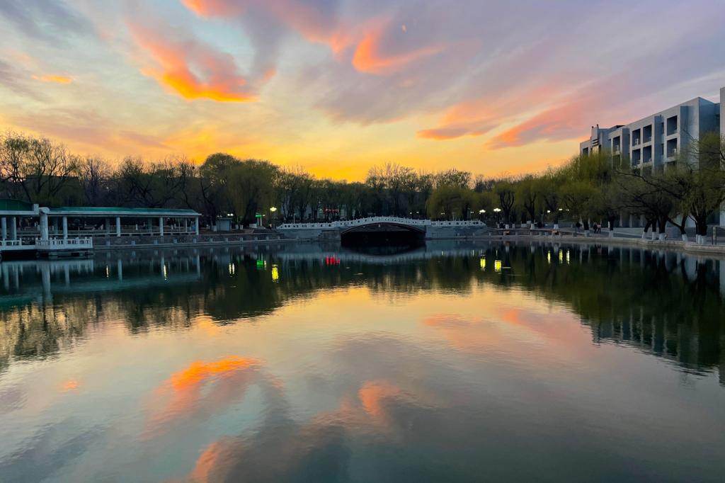 落日之后,驻足凝望着燕园的天空上冷色与暖色碰撞出的美好