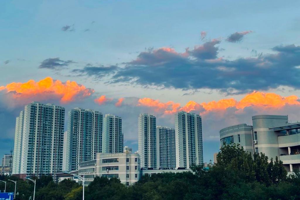 软绵绵、膨松松的云朵拥抱着暮色下的图书馆