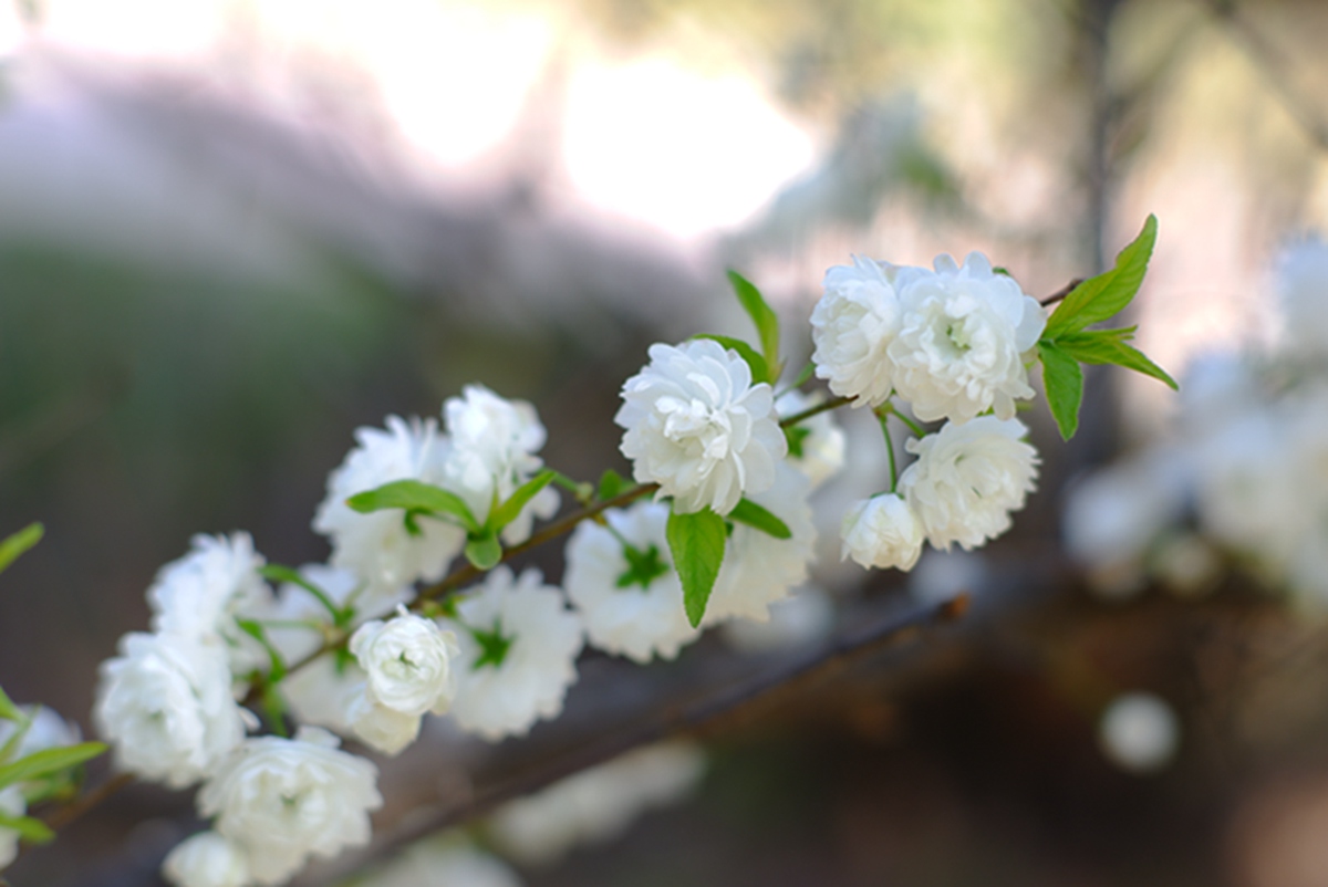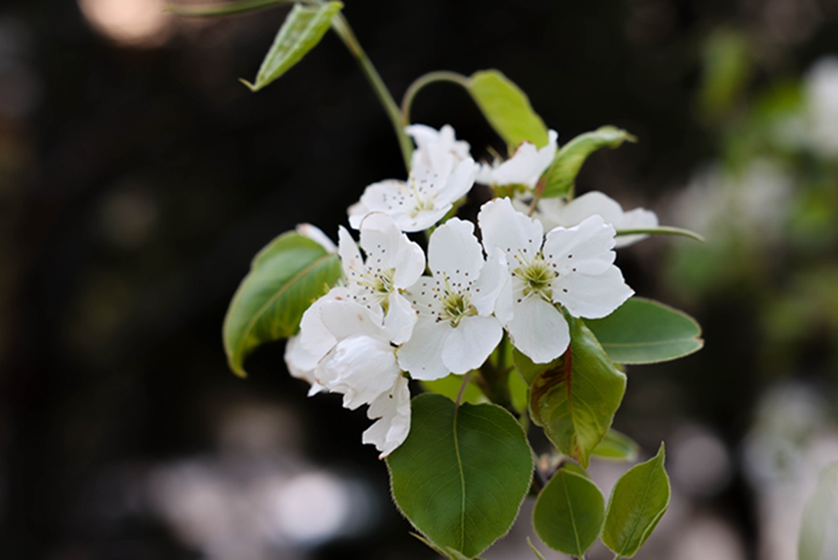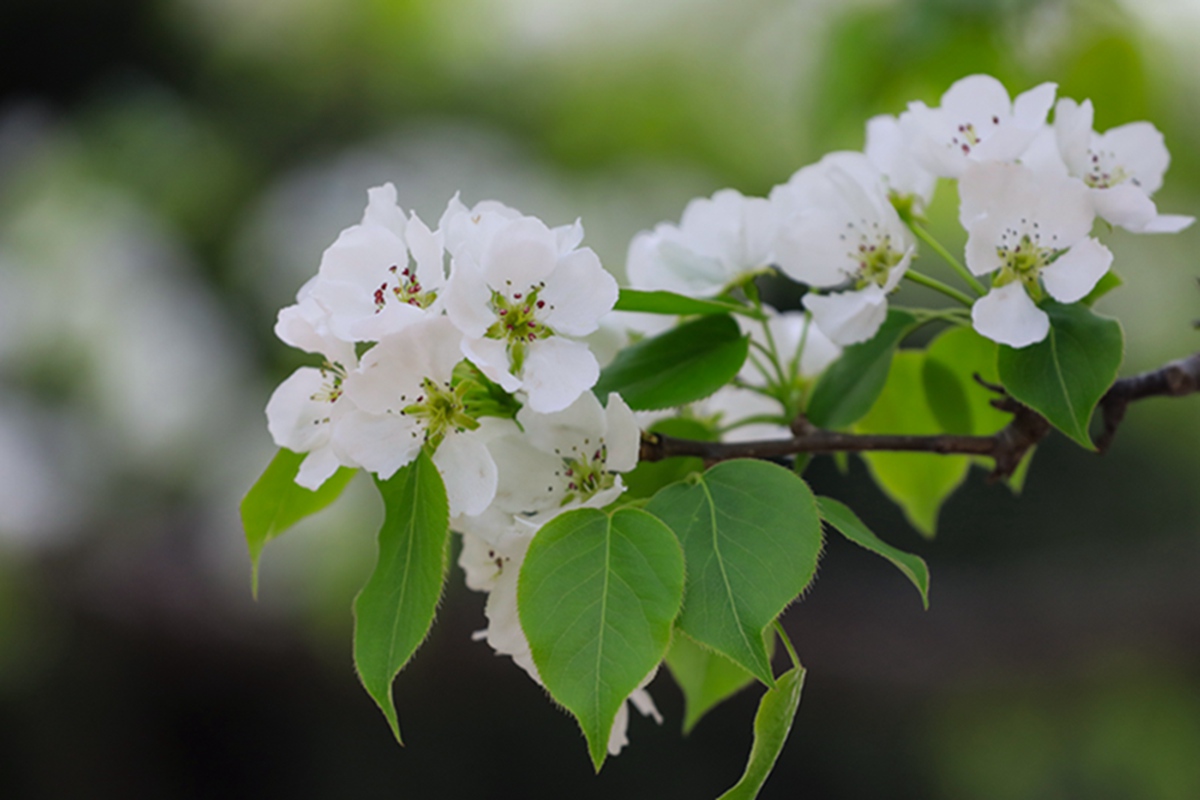 梨花花朵成簇,叶青色,花朵与新叶同生,花簇像白色的花椰菜。