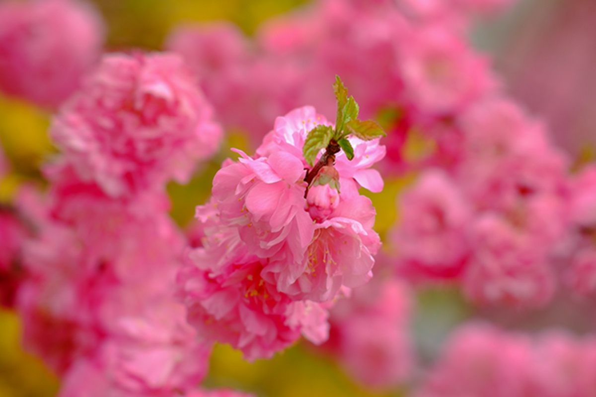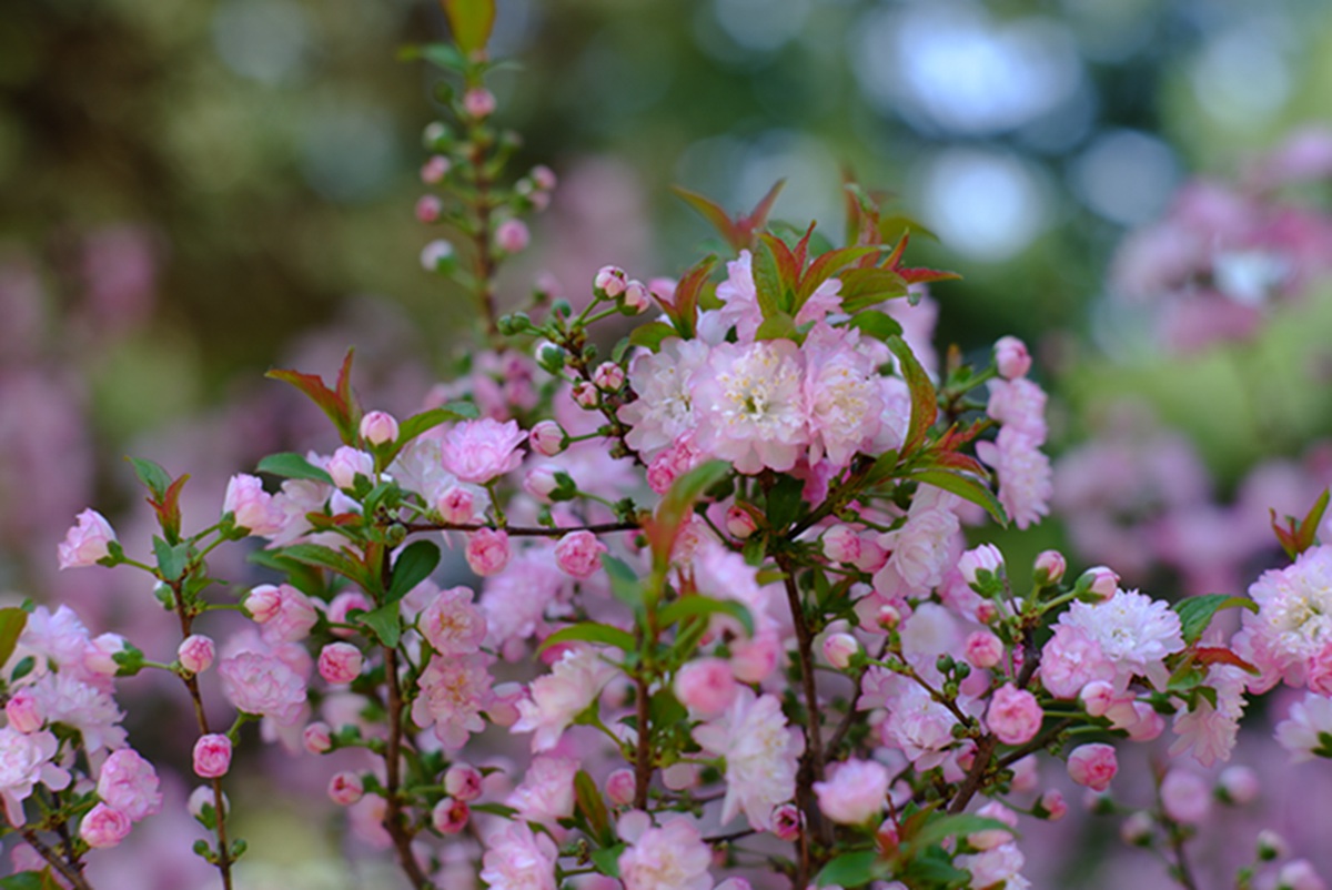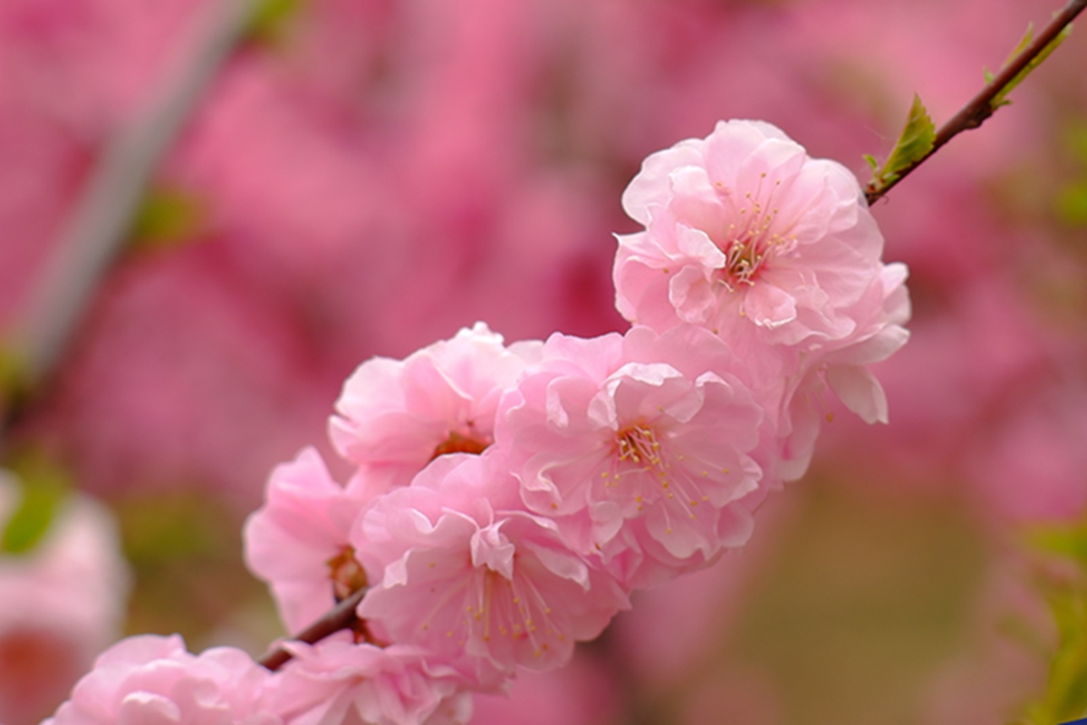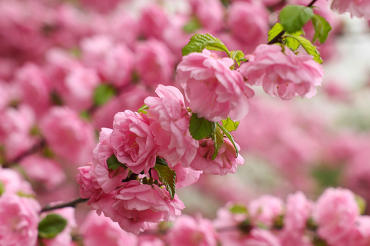 桃花最好辨认的特征是叶子:桃树先叶后花,且叶子细长,而樱花、海棠花、梨花等等大多是椭圆、卵形等比较宽的形状。桃花一般呈粉色,因此古代赞美女子会说“面若桃花”,由此可记住桃花是像腮红一样白里透红的粉色,而非纯白色。