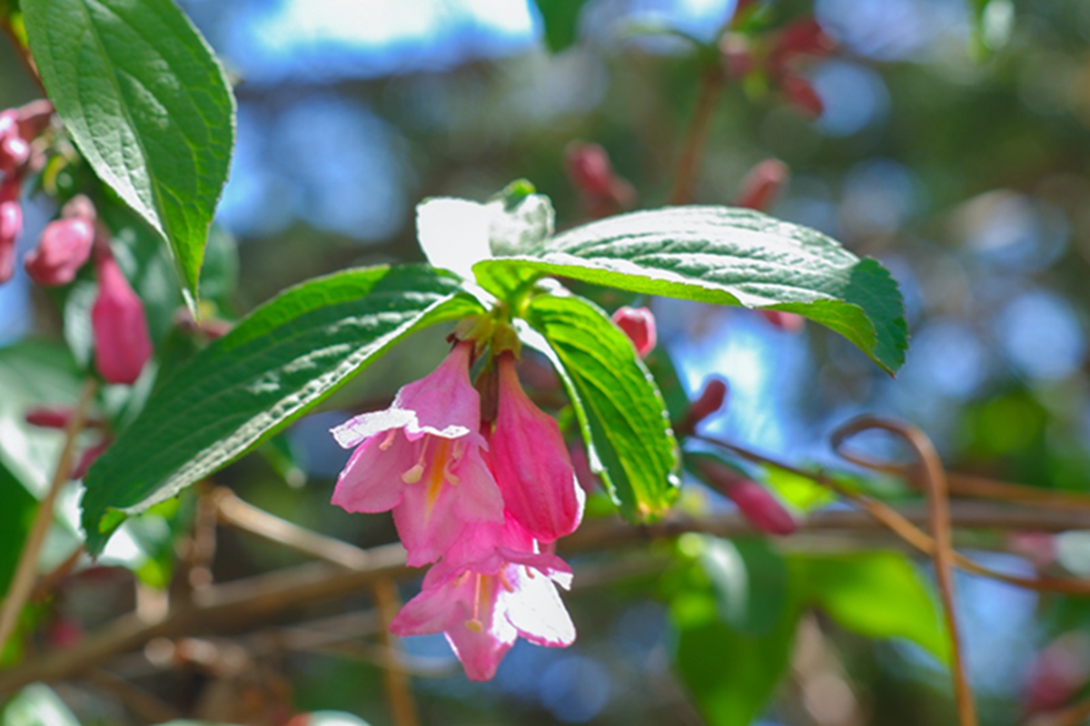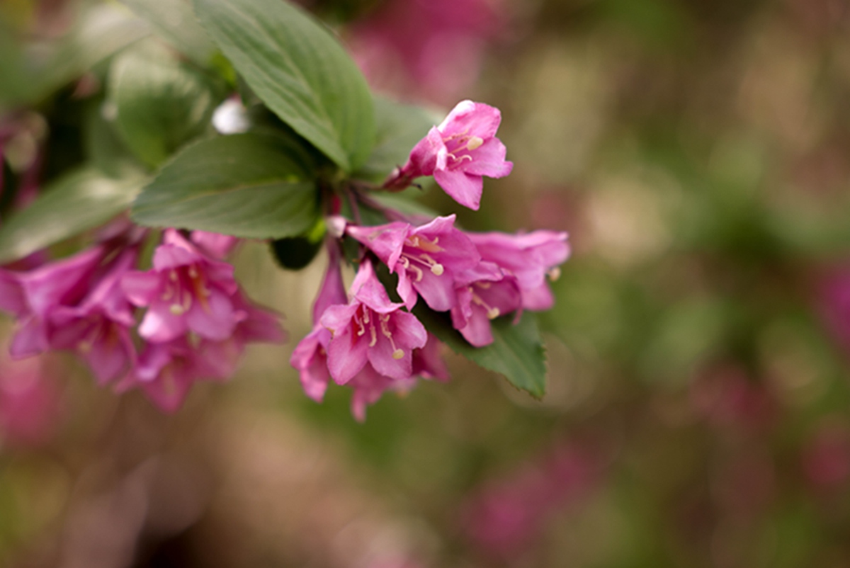 锦带花灌木,枝条开展,树型较圆筒状,有些树枝会弯曲到地面,叶椭圆形或卵状椭圆形,端锐尖,基部圆形至楔形,缘有锯齿,表面脉上有毛,背面尤密。花冠漏斗状钟形,玫瑰红色,裂片5。