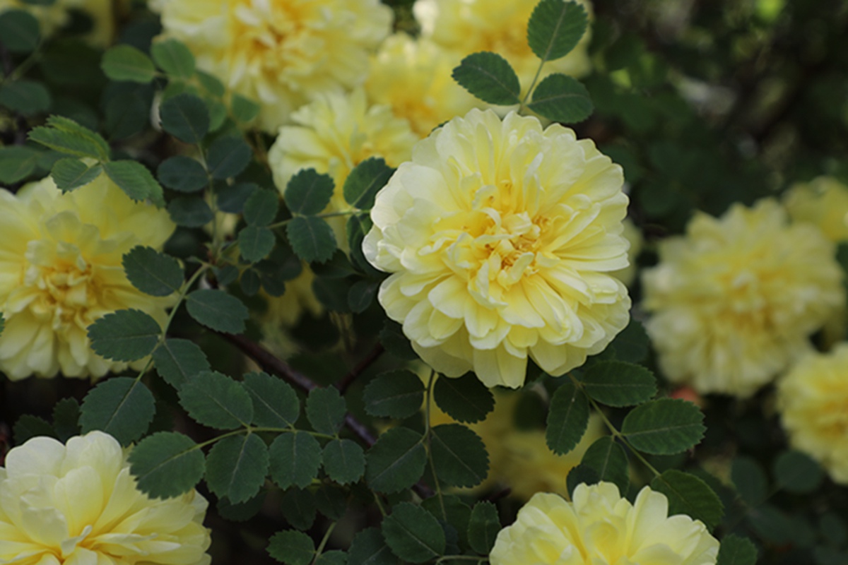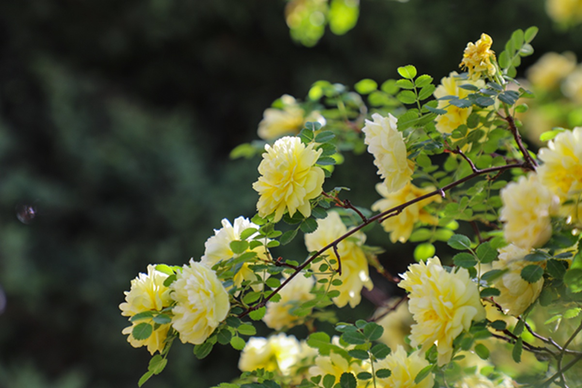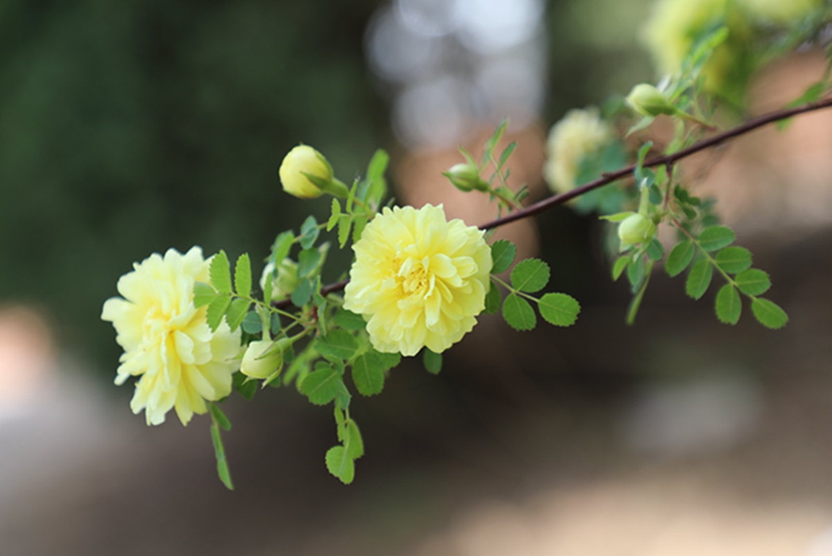 枝粗壮,密集;小叶片呈宽卵形或近圆形,边缘有圆钝锯齿,上面无毛;叶轴、叶柄有稀疏柔毛和小皮刺;花单生于叶腋,重瓣或半重瓣,呈黄色;花梗长1-1.5厘米,无毛,无腺;果实呈近球形或倒卵圆形,紫褐色或黑褐色。
