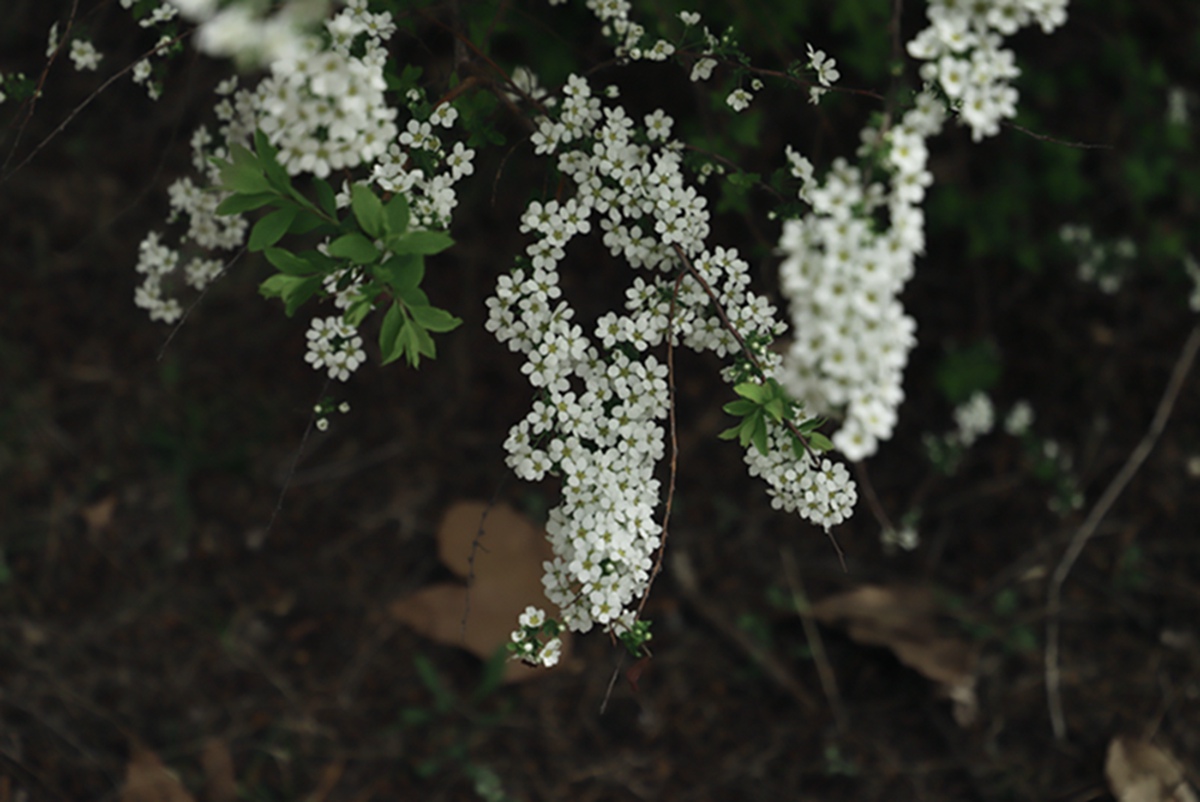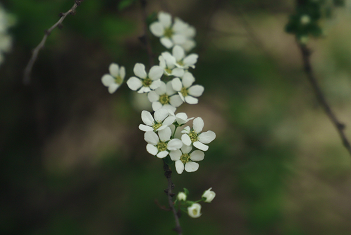 珍珠绣线菊是蔷薇科绣线菊属的灌木,高可达1.5米。枝条呈弧形弯曲,有稜角,幼时褐色,老时转红褐色;冬芽卵形,无毛或微被毛;叶片线状披针形,先端长渐尖,基部狭楔形;伞形花序无总梗,基部簇生数枚小形叶片;萼筒钟状,萼片三角形或卵状三角形,白色花瓣倒卵形或近圆形。
